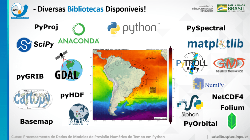 matplotlib cartopy imageio boto3 netcdf4 pyhdf gdal scipy pandas scikit-learn: as bibliotecas que desejamos instalar. Existem muitas outras bibliotecas disponíveis, estas são as que utilizaremos no treinamento.
