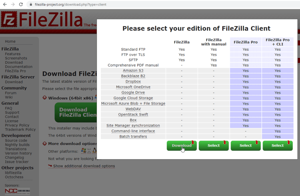 Baixe e instale a versão gratuita mais recente do FileZilla. Neste procedimento, a versão 3.59.0 foi utilizada.