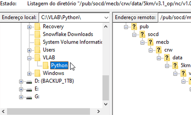 Para obter amostras de produtos de oceanografia por satélite, vamos baixar dados de servidores FTP abertos da NOAA utilizando o software Filezilla.