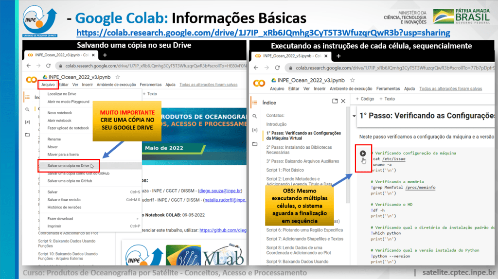 Prezados participantes do curso: “Produtos de Oceanogradia por Satélite – Conceitos, Acesso e Processamento”, segue abaixo o link do “notebook” interativo do Google Colab com as atividades do curso.