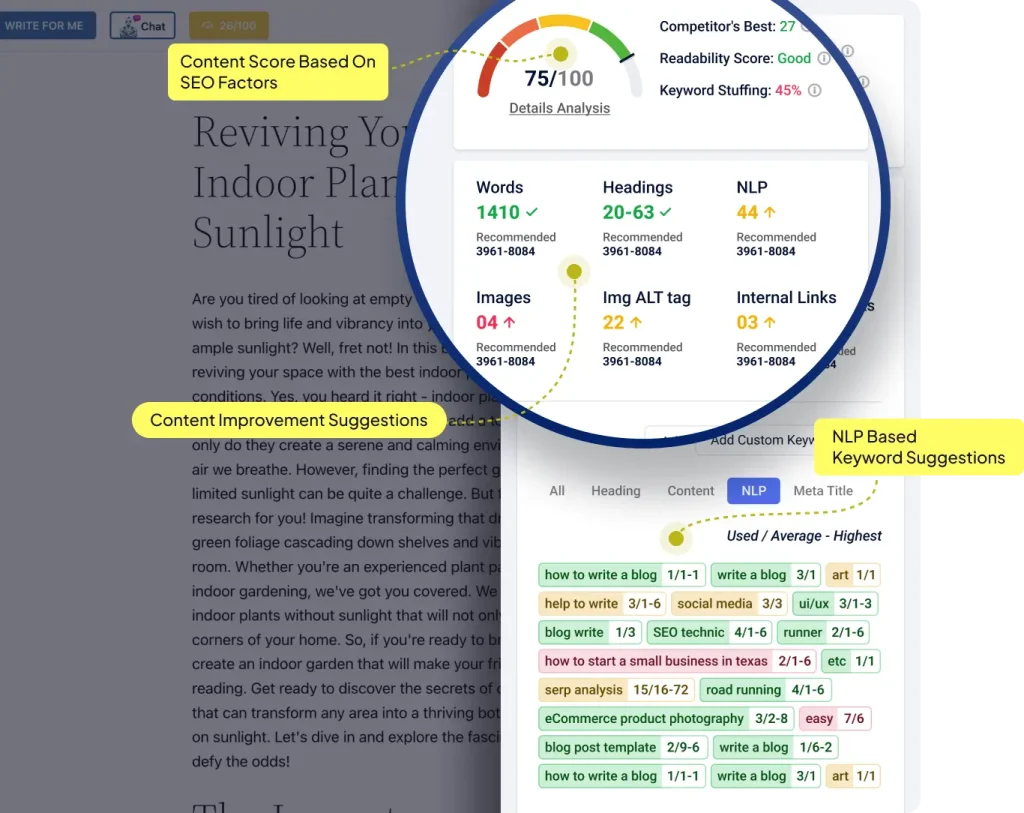 Fill any content optimization gap with GetGenie’s predictive analytics-based AI suggestions. Make content SERP-ready with its effective content optimization elements.