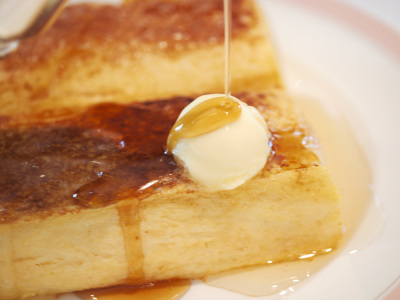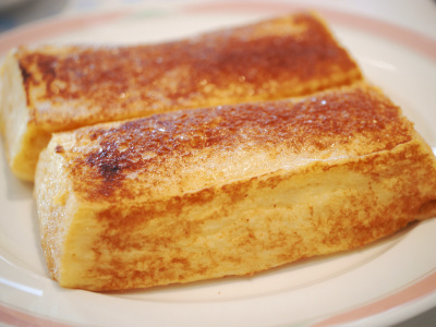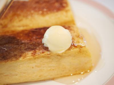 かなり厚めのパンですが、どこを切っても中まで卵が染み込んでいて、みずみずしくプルプルとしています。表面のカリカリ感と中のプルプル感がとてつもなく魅惑的で、ひと切れ食べると早く次のひと切れをほお張りたくなってしまう感じ。バターとシロップ以外はつけ合わせもなにも無いのですが、そんなことは少しも気にならない、これだけで完成された朝食という感じがします。