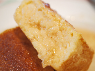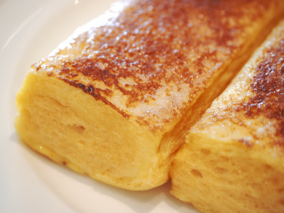 ナイフで切ってみると、表面はカリカリで、中はプリンのような柔らかさ。口に入れると、卵と牛乳、バニラエッセンス、シナモン、それぞれが絶妙に調和したなんとも言えない優しい風味が口の中に広がります。このベースの味はメープルシロップやハチミツをかけても負けないくらいにしっかりとしているので、たっぷりシロップをかけてもフレンチトーストの魅力を十分に味わうことができる感じ。