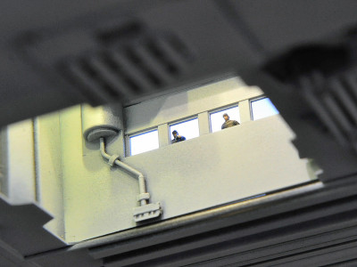 巨大なスター・デストロイヤーの艦橋と、そこにいる「ミレニアム・ファルコン」を再現した作品「ファインモールド 1/144 ミレニアム ファルコン」が圧倒的な存在感を放っています。ちなみに、スター・デストロイヤーの艦橋はオマケとのこと。