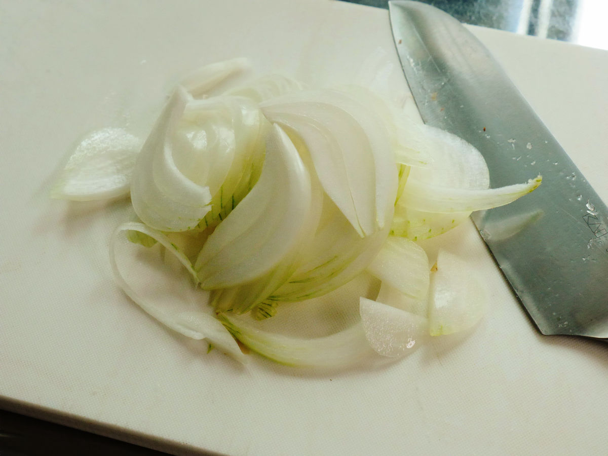玉ねぎを薄切りにします。