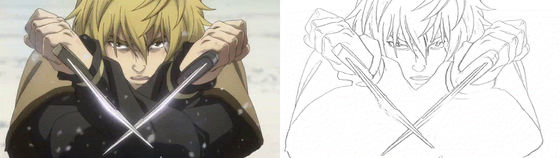 さらに、アニメのワンシーンを線画にしてしまうことも可能。以下はアニメ「ヴィンランド・サガ」のオープニングのワンシーンを線画に変換したもので、サムネイルをクリックするとGIF画像が再生されます。