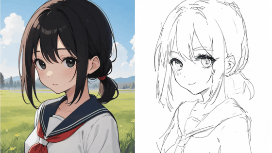 実際にどのような線画が出力できるのかというと、以下の通り。左が入力画像(イラスト)で、右が出力画像(線画)。