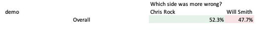 結果を細かく見ていくと、トータルでは「クリス・ロックのほうが悪い」が52.3%、「ウィル・スミスのほうが悪い」が47.7%。