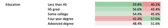 教育水準ごとでは、低学歴ほど「クリス・ロックのほうが悪い」、高学歴ほど「ウィル・スミスのほうが悪い」。なお、ここの分類は「Less than HS(高卒未満)/HS grad(高卒)/Some college(大学中退ないしは聴講制度満了)/Four year degree(大卒)/Advanced degree(修士号ないしは博士号取得者)」。