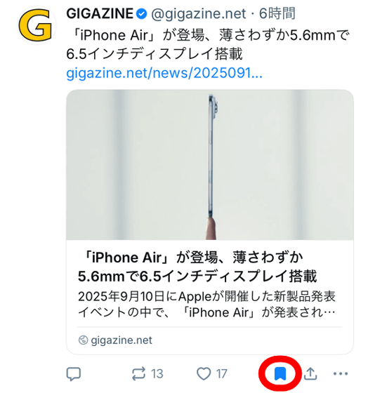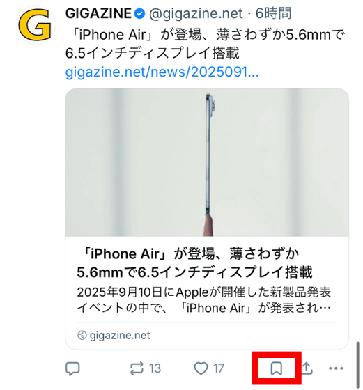 各投稿下部のいいねボタンの右隣に追加されたボタンがブックマークボタンです。実際にタップしてみます。