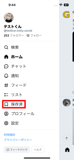 ブックマークした投稿はメニュー内の「保存済」をタップすると確認できます。