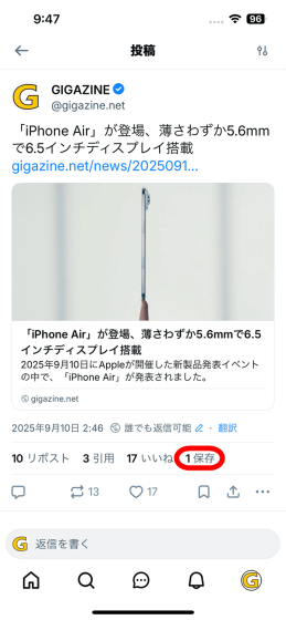 各投稿には「何回ブックマークされたか」という情報が表示されます。ウェブアプリ版Blueskyの場合は「○保存」という部分をクリックしても何も起きず、スマートフォンアプリ版の場合は「○保存」という部分をタップすると「いいねしたユーザーの一覧画面」が表示されました。