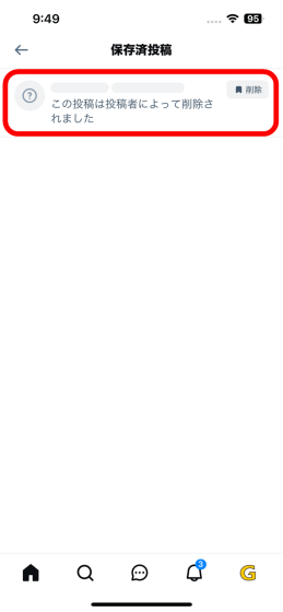 ちなみに、ブックマークした投稿が削除された場合、「削除された」というメッセージだけが残り投稿内容は閲覧できなくなります。