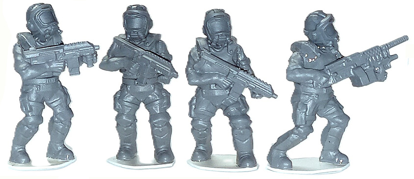 For many years, the Defiance Marines have been a secret delight for me. They were perfect for Near Future games, Zombie scenarios, or Bug Hunts. The weapons were well done, and all in an advancing/firing pose, making them quick and easy to build. Detail could be indistinct, and they weren’t ‘heroic’ if that ‘s what you want.