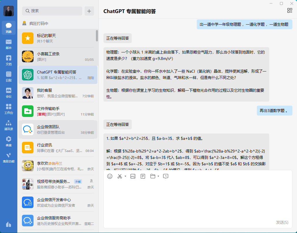 💯 下面就可以直接体验了,手机或电脑上企业微信进入自己创建的应用,可以和ChatGPT的聊起来了。