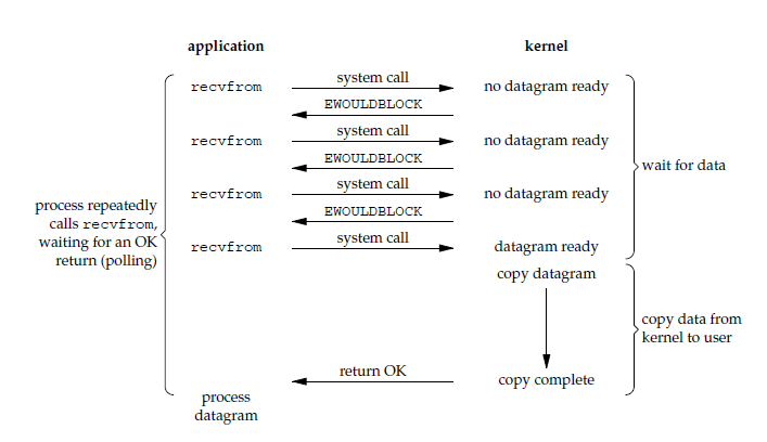ssize_t recvfrom(int sockfd, void *buf, size_t len, int flags, struct sockaddr *src_addr, socklen_t *addrlen);应用进程执行系统调用之后,内核返回一个错误码。应用进程可以继续执行,但是需要不断的执行系统调用来获知 I/O 是否完成,这种方式称为轮询(polling)。