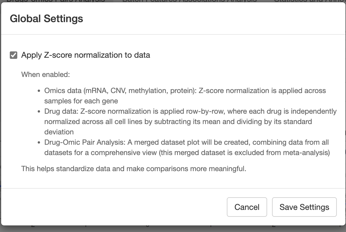 - Add choice to filter data for a specific tumor type(Breast, lung..) or data type(cell line, PDO), and a global setting page to set data. Now all continous data is transformed to by z-score in default, which allow to add a merged result for visualization ;