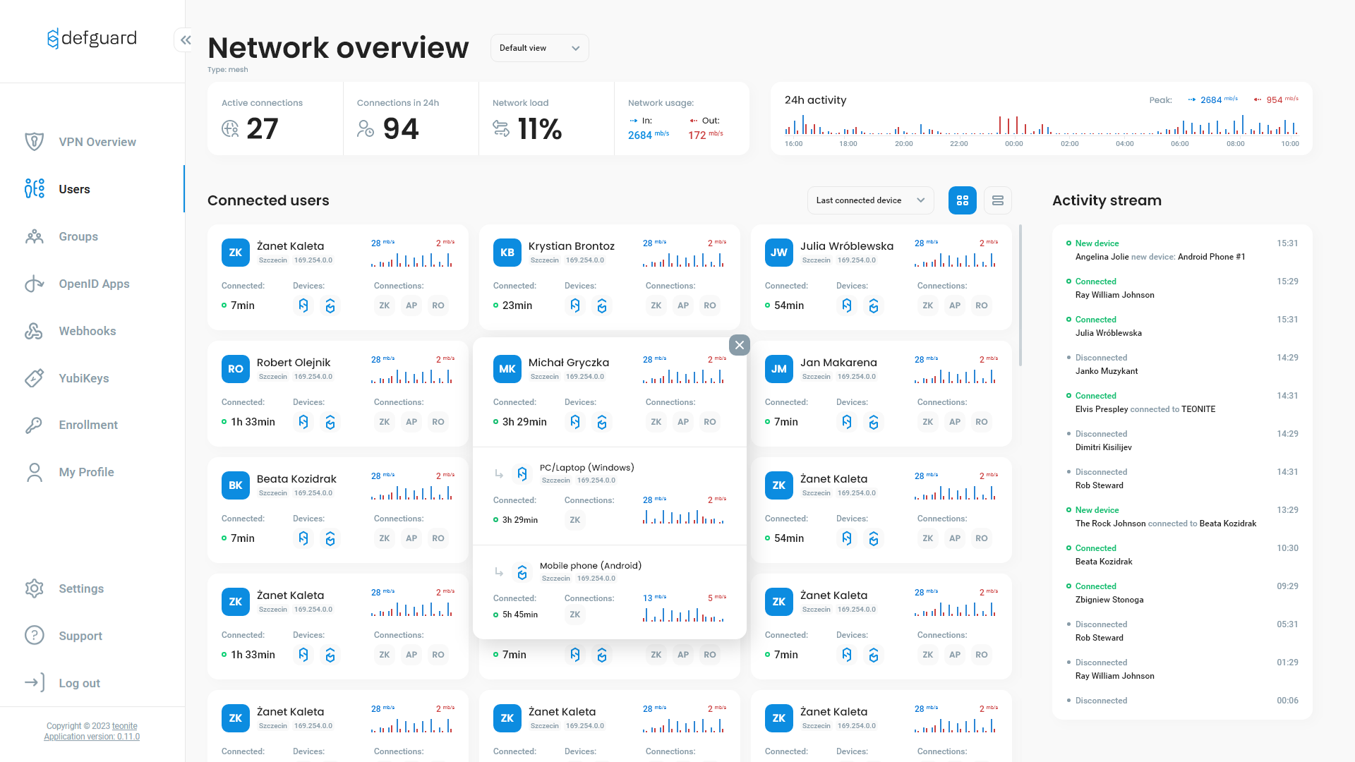 - Users self-service (besides typical data management, users can revoke access to granted apps, MFA, WireGuard®, etc.)