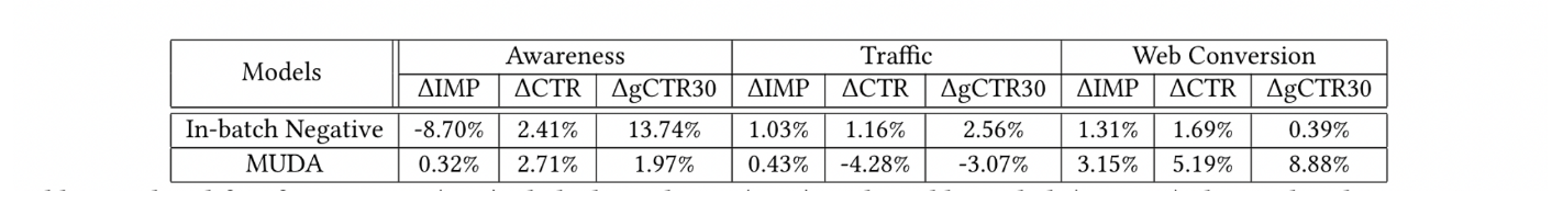 Awareness是指知名度,Traffic是流量,web conversion则是指转化。batch内负采样模型在知名度广告上的点击提升是因为展现数的大量减少。知名度广告这种主要是提高品牌知名度的,本身点击就比其他类型的广告少,而batch内负采样都是在点击正例上训的,自然对这种广告不友好。流量广告则是为了提升知名度,挖掘潜在客户,推动转化。而batch内负采样模型在这种类型广告上取得了一致的提升,还是因为它的训练集都是一些高点的交互pair,所以挖掘的广告倾向于吸引高点记录的用户。MUDA在转化广告方面取得了最高的一致性提升,因为学的排序预估分可能倾向于高转化的,同时分桶策略也进一步促进了更高转化质量的广告候选的挖掘。
