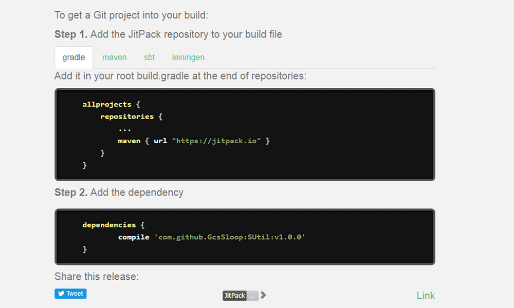 在上传完成之后,JitPack会自动生成引用该仓库的配置信息,如下: