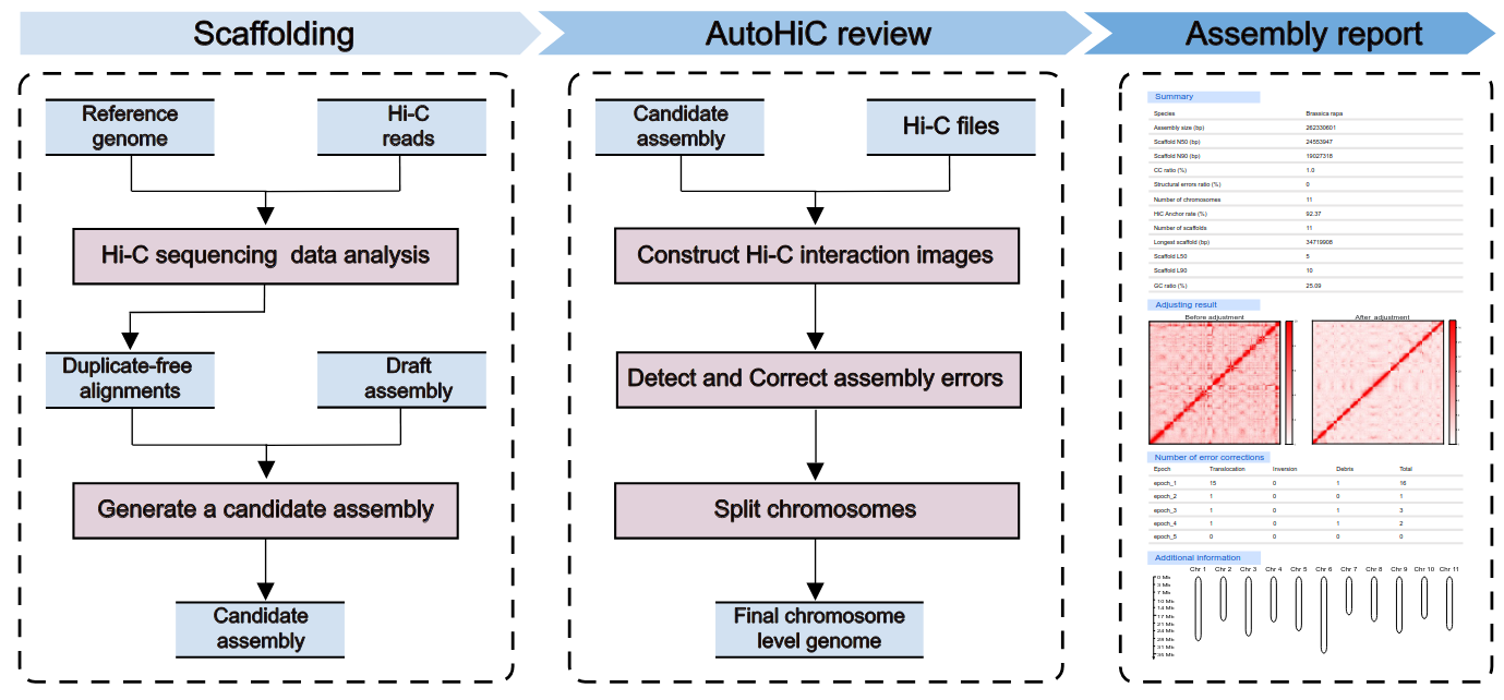 AutoHiC is a deep learning tool that uses Hi-C data to support genome assembly. It can automatically correct errors during genome assembly and generate chromosome-level genome.