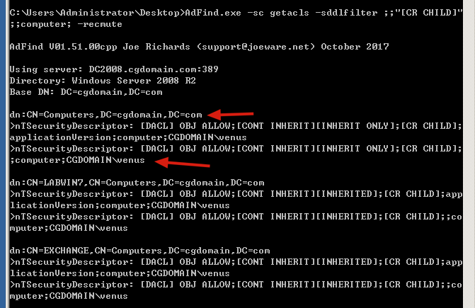AdFind.exe -sc getacls -sddlfilter ;;"[CR CHILD]";;computer; -recmute