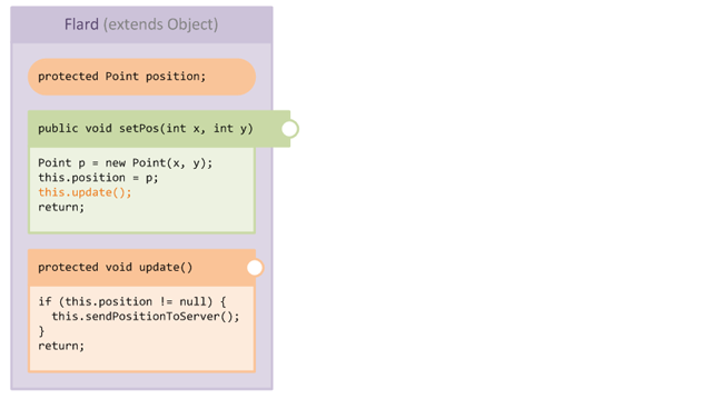 Let's consider the flow of execution when the setPos setter is called from some external code: