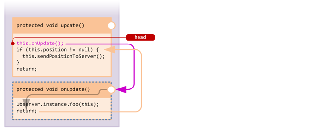 The injected callback to our handler function is shown here in purple. Unlike an overwrite, the original behaviour of the target method is untouched, and our handler method simply receives a callback at the start of the method.