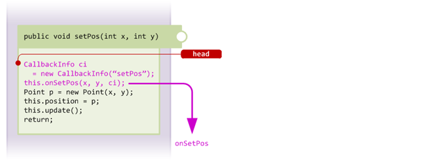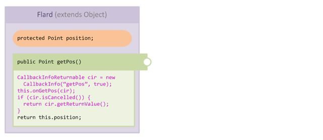}In the above code, the handler checks whether the position is being set to (0, 0) and performs some custom logic instead, marking the callback as cancelled to cause the target method (setPos) to return immediately after the injection. We can see how his works by looking at the code injected into setPos, which looks like this: