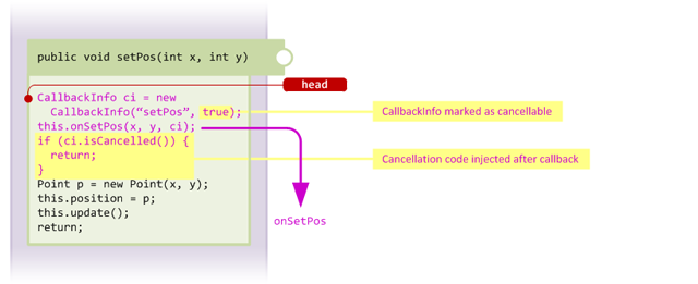 The injector first merges our handler method into the target class, next it injects code into the target method to handle the cancellation.