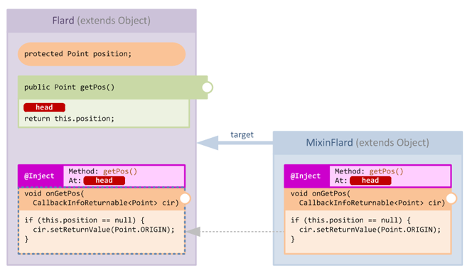 The getPos method is a typical getter method in that its method body simply returns the value of a protected field. Let's add a mixin which injects at HEAD and returns a defaulted value if the field is null: