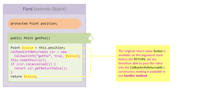Since we know that a RETURN opcode must return a value, we know that the value is available for us to access whenever we inject at RETURN. The injection processor handles this situation and "captures" the return value into the CallbackInfo passed to our handler: