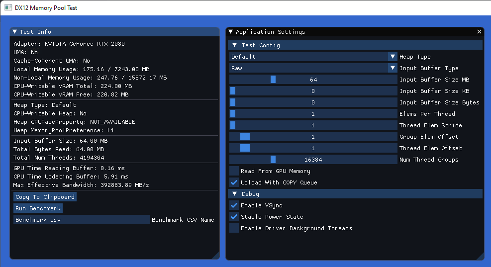 The app uses the latest (as of 1/4/2024) DirectX Preview Agility SDK to enable support for GPU Upload Heaps. If running on a system with ReBAR supported and enabled, the D3D12_HEAP_TYPE_GPU_UPLOAD heap type will be available in the app which allows directly writing to VRAM from the CPU. This preview SDK requires Developer Mode to be enabled, as does usage of SetStablePowerState to ensure consistent clock speeds for benchmarking.