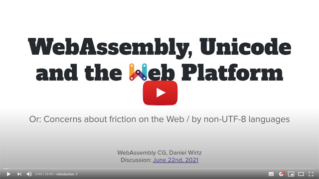 This issue is for accompanying discussion of "WebAssembly, Unicode and the Web Platform". The presentation is pre-recorded, which is what we decided to try out in WebAssembly/meetings#775, with discussion time scheduled for June 22nd's CG video meeting.