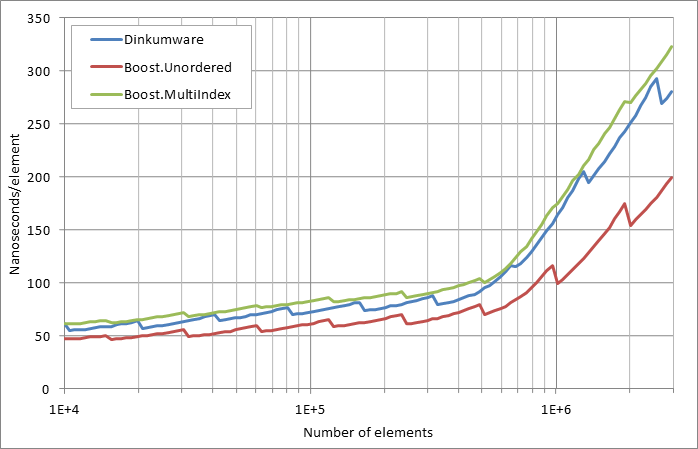 unique_running_insertion.cpp: insertion of n randomunsigned ints into a set, n = 10,000 to 3M.non_unique_running_insertion.cpp: same as above, but the container is a multiset and elements are repeated an average of 5 times.unique_scattered_erasure.cpp: erasure by iterator in random order of the n elements of a set filled as above.non_unique_scattered_erasure.cpp: same as prior, but with multisets.non_unique_scattered_erasure_by_key.cpp: erasure by key of all the elements of a multiset ofstd::strings filled with random strings with average repetition 5, n = 10,000 to 3M.unique_scattered_lookup.cpp:- Successful: lookup of the n keys of the container in the same order as inserted.