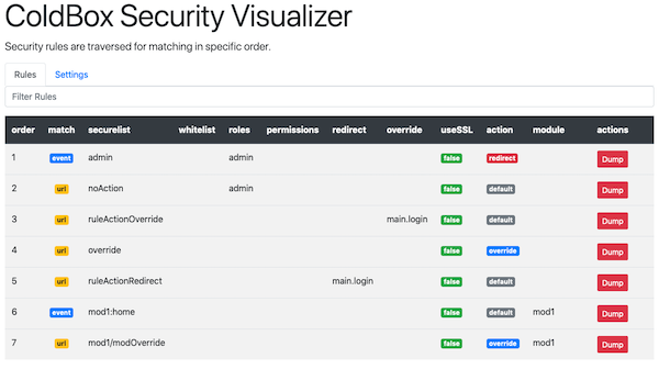 This module also ships with a security visualizer that will document all your security rules and settings in a nice panel. In order to activate it you must add the visualizer setting to your config and mark it as enabled. Once enabled you can navigate to: /cbsecurity, and you will be presented with the visualizer.