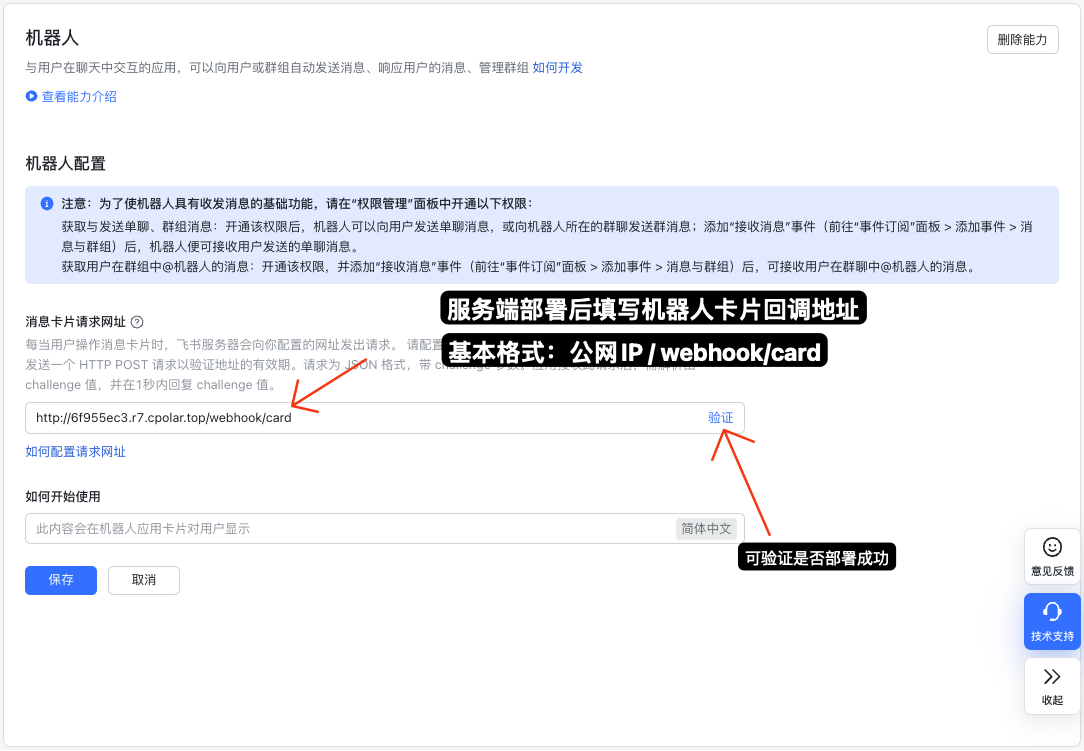机器人板块,填写消息卡片请求网址。例如,http://xxxx.r6.cpolar.top为 cpolar 暴露的公网地址/webhook/card为统一的应用路由- 最终的消息卡片请求网址为