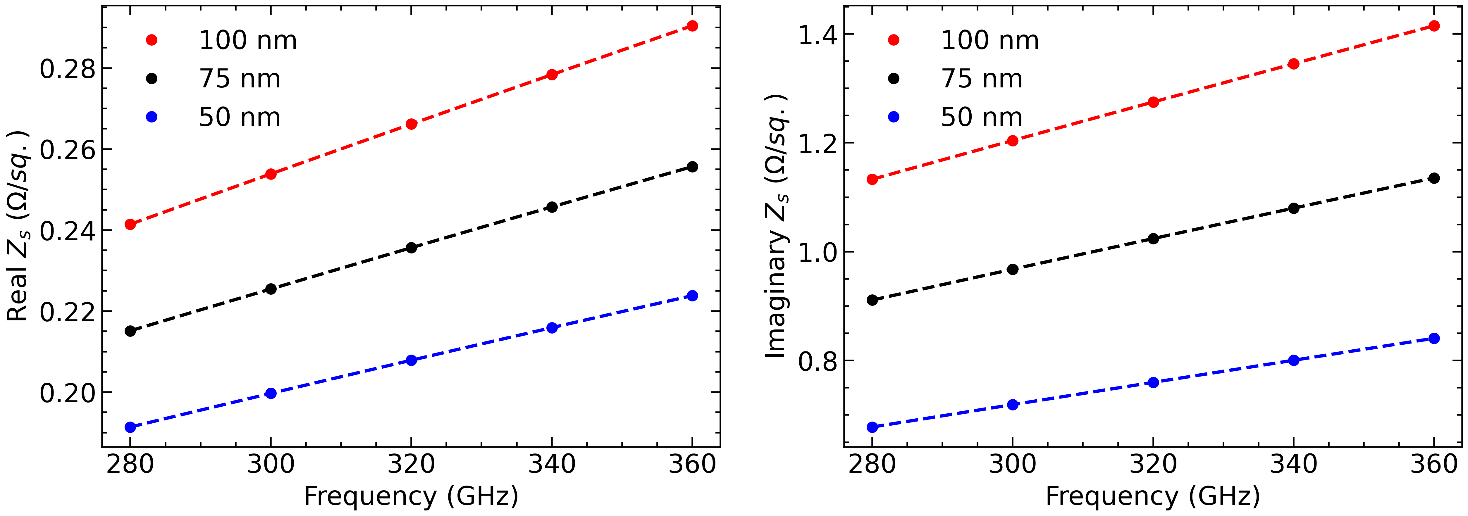 Surface impedance of gold (conductivity: 4.1e7 S/m) between 280 GHz and 360 GHz:
