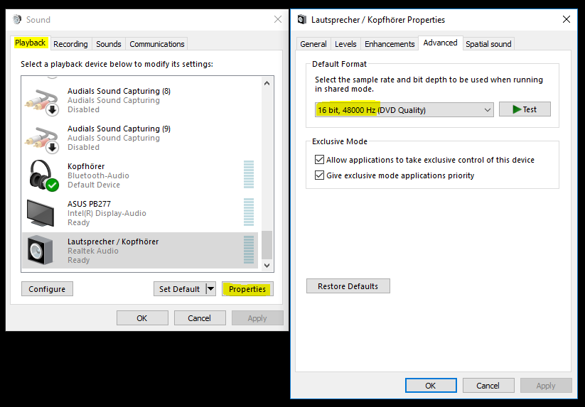 In loopback mode, whatever you playback through your soundcard will be analysed. Before using it please set the right output format for your soundcard. To do so, go to the Sound settings in the control panel, select your default playback device and click on Properties. Most devices will now allow you to set a default format. Choose 16 bit, 48000 Hz and press OK.
