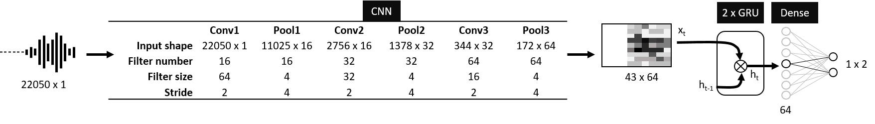 The model we are using has been trained with Tensorflow. It takes as input the raw audio input and feeds it into a 3-layer Convolutional Network. The result of this filter operation is then processed by a 2-layer Recurrent Network containing 64 RLU cells. The final bit is a fully-connected layer, which applies a softmax and maps the input to a tuple <noise, voice> in the range [0..1].