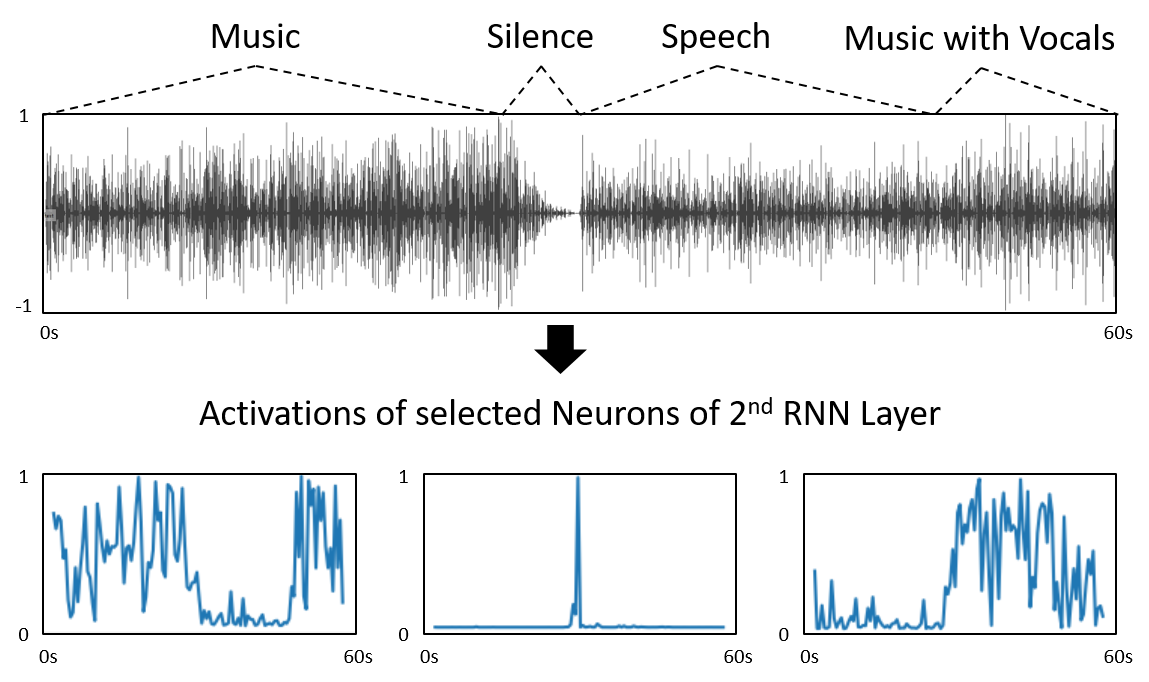Some selected activations of the last RNN layer for an audio sample containing music and speech: