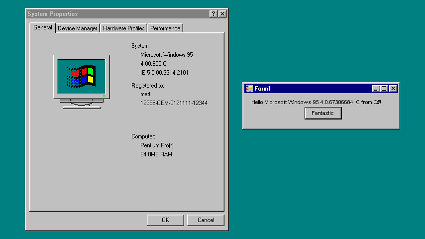 • Microsoft USB Supplement. The installer is packaged in this repository at bin/usbsupp or may be on your Windows 95 install disc at other/updates/usb. This is why 95 B is necessary, the USB supplement makes patches to VMM32.VXD that allow .NET to work, and it isn't available on RTM/A. I am currently investigating why this is necessary and whether it can be patched out.
