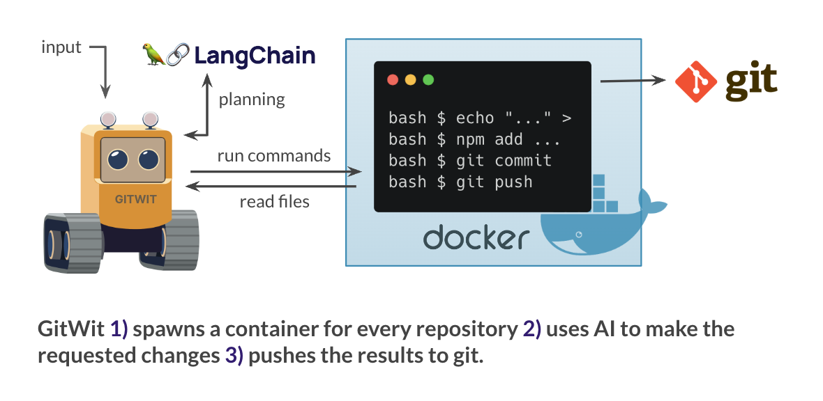 GitWit is a container-based agent specialized in making useful commits to git repositories. Given a description (i.e. "implement dark mode") it either checks out a repository or creates a new one, makes these changes, and then pushes the changes to master. (Skip to How it works.)