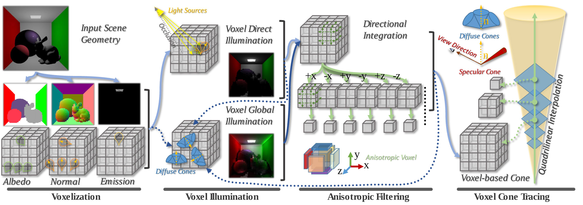 Deferred voxel shading is a four-step real-time global illumination technique inspired by voxel cone tracing and deferred rendering. This approach enables us to obtain an accurate approximation of a plethora of indirect illumination effects including: indirect diffuse, specular reflectance, color-blending, emissive materials, indirect shadows and ambient occlusion. The steps that comprehend this technique are described below.