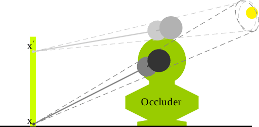 Cone tracing can also be used to achieve soft shadows tracing a cone from the surface point x towards the direction of the light The cone aperture controls how soft and scattered the resulting shadow is. For soft shadows with cones we only accumulate the occlusion value at each step.