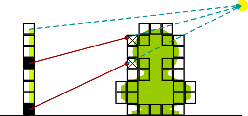 Our proposal also computes occlusion using raycasting within a volume. Any of the resulting volumes from the voxelization process can be used since the algorithm only needs to determine if a voxel exists at a certain position. To determine occlusion of a voxel, a ray is traced from the position of voxel in the direction of the light, the volume is sampled to determine if at the position of the ray there is a voxel, if this condition is true then the voxel is occluded.