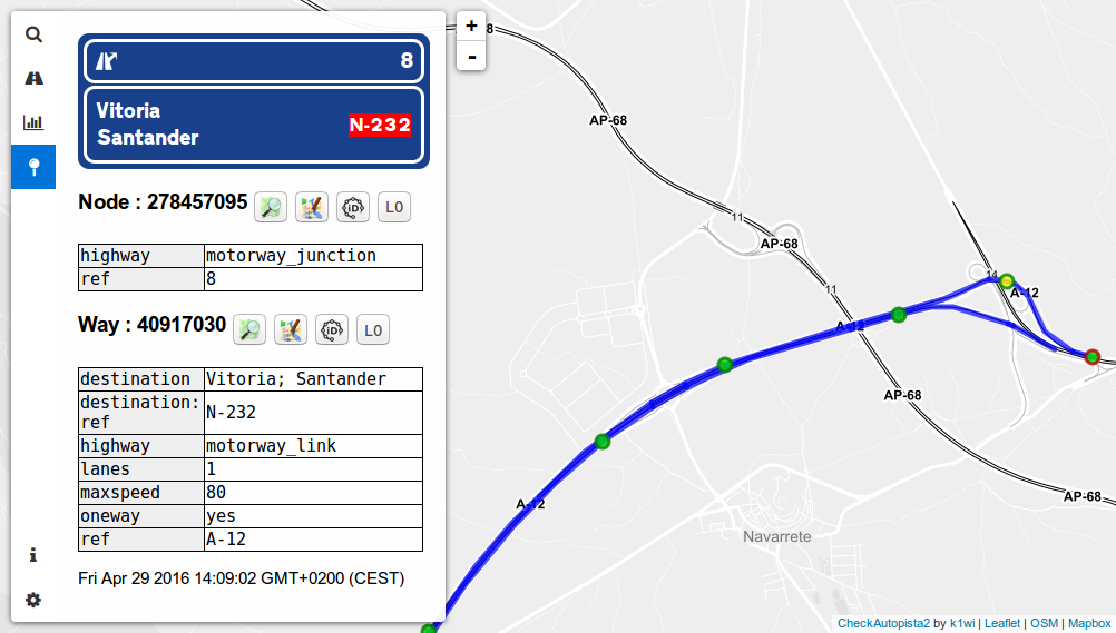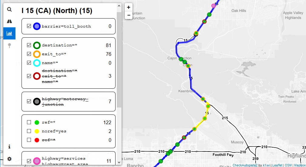 CheckAutopista is a quality assurance tool for motorways in OpenStreetMap. With CheckAutopista you cand easily find tagging errors or missing data in any motorway from around the world.