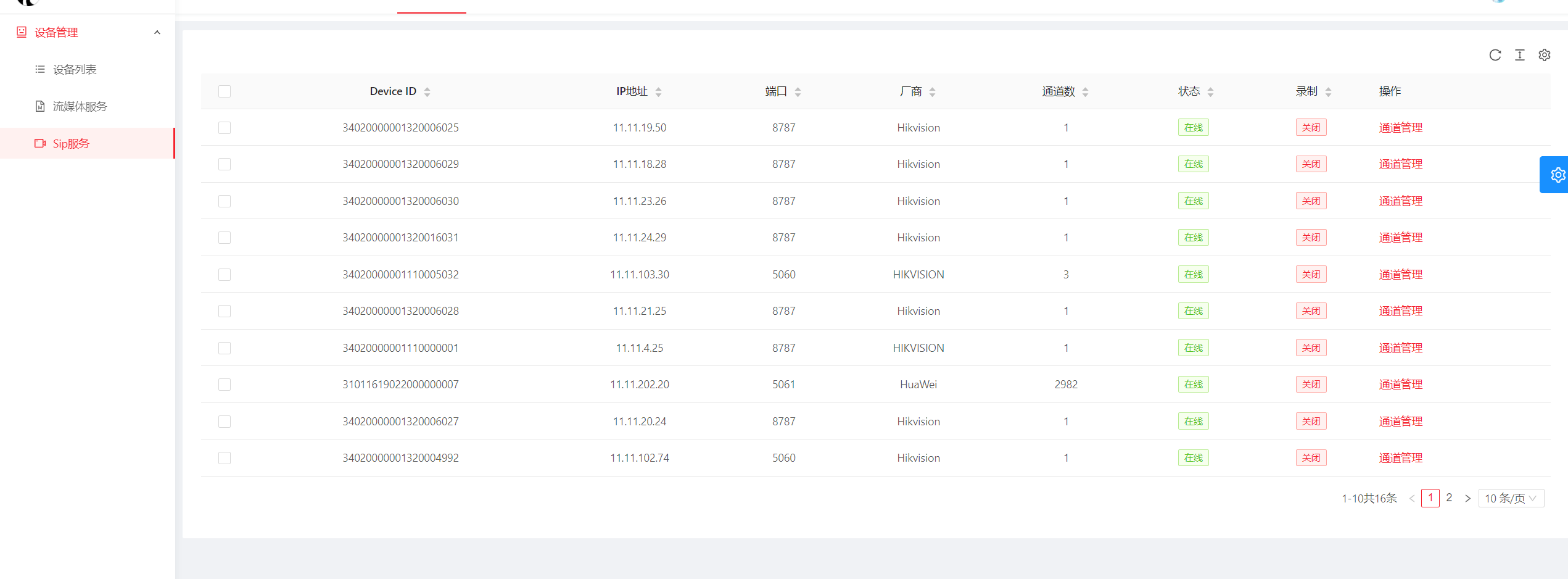 - 设备列表:管理GB28181通过Sip网关添加到数据库中的设备。