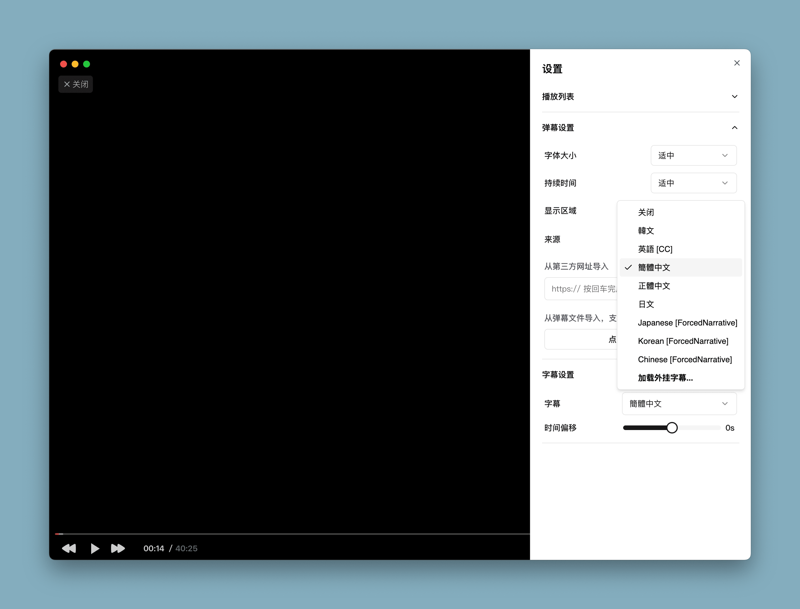 - 支持设置弹幕字体大小、持续时间、显示区域
