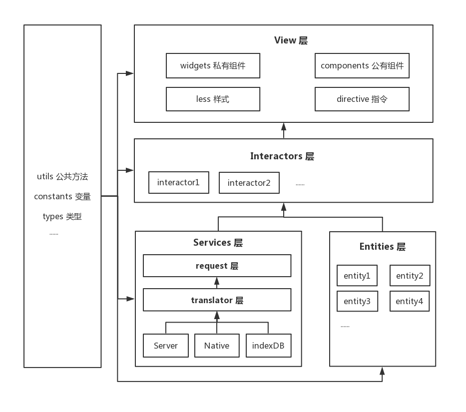 Services 层是用来对底层技术进行操作的,例如封装 AJAX 请求,操作浏览器 cookie、locaStorage、indexDB,操作 native 提供的能力(如调用摄像头等),以及建立 Websocket 与后端进行交互等。